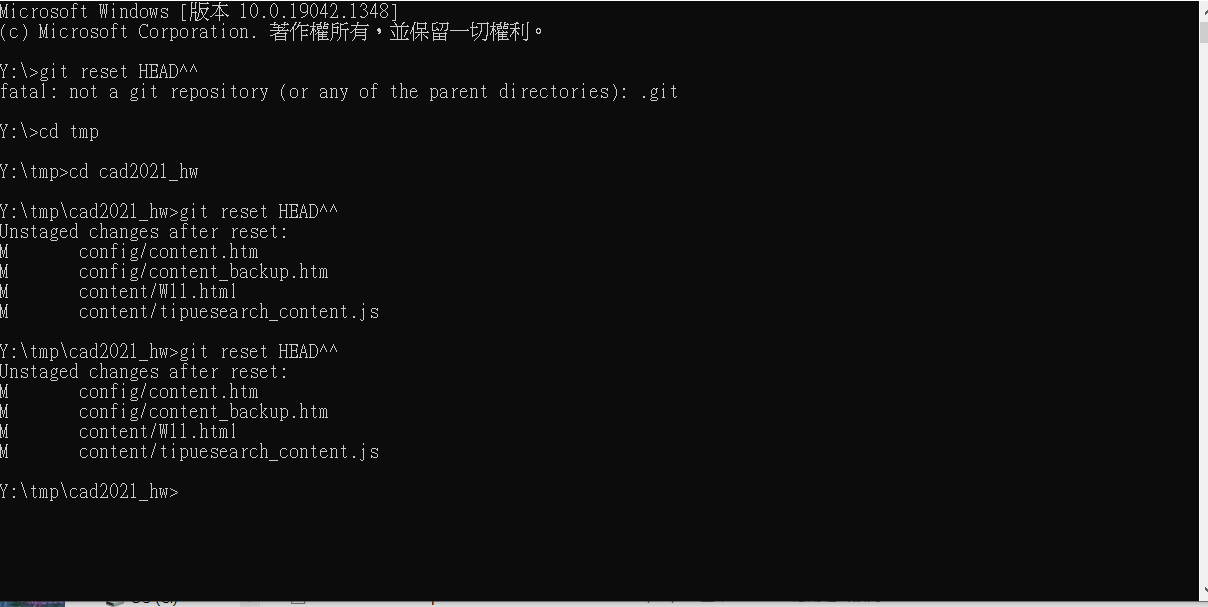 3. 將HEAD移回正確的提交用 git reset HEAD^^(代表往後移兩個commit